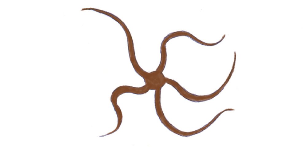 The ophiuroids are similar to starfish but have slender and mobile arms, used to crawl on the bottom. They have a distinct central disc. They are predators or feed on debris that they ingest with the mouth, present in the lower part of the body.
