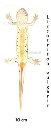 Larva neotenica, Monti Simbruini circa 10 cm. Le larve neoteniche sono individui che non subiscono mai la metamorfosi e non generano mai i polmoni sebbene raggiungano la maturità sessuale. Rimangono quindi tutta la vita in acqua .